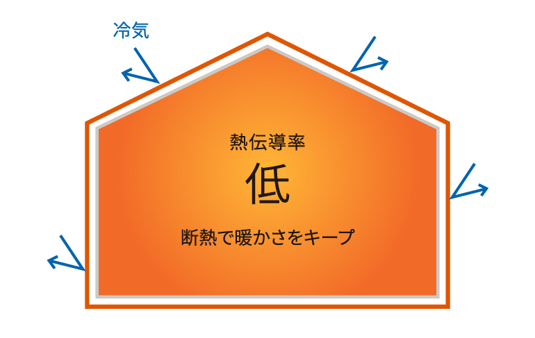 冬の寒さ対策に重要とされる断熱材の性能を表すのが「熱伝導率」。熱伝導率とは、断熱材が熱をどれだけ伝えやすいかを表した数値で、値が低いほど熱を伝えにくく、断熱性能が高いということになります。外の冷気をシャットアウトし、一度暖めた室温を魔法瓶のように逃さない。家じゅうどこにいても、春のような穏やかな暖かさが続く家。熱伝導率はどの断熱材でも重要とされ数値が低いほど良質とされています。