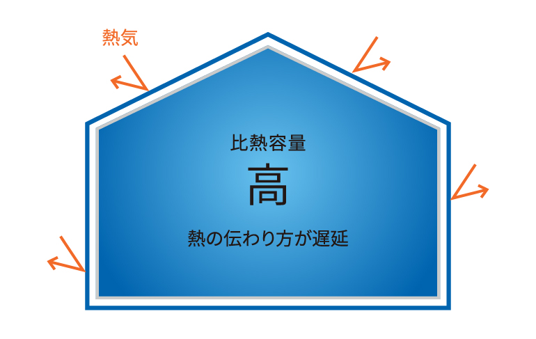 一般的な断熱材は、冬の寒さには強くても、真夏のじりじりとした熱の侵入を防ぐのは苦手なことがあります。そこで重要となるのが、温度を1°C上げるのに必要な熱量を表す「比熱容量」です。この数値が大きいほど熱の伝わりが遅延し、夏の暑さ対策に有効といわれています。特に太陽熱の影響を受けやすい屋根に、「比熱容量」の大きい断熱材を使用することで、夏の室温上昇を抑制するのに大きな効果を発揮します。