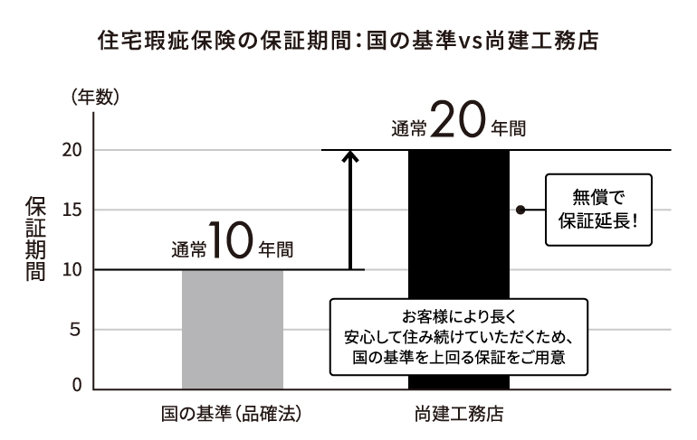 家の寿命を左右する構造躯体や雨漏り防止といった重要な部分を、一般的な基準の2倍の期間で手厚くサポートいたします。