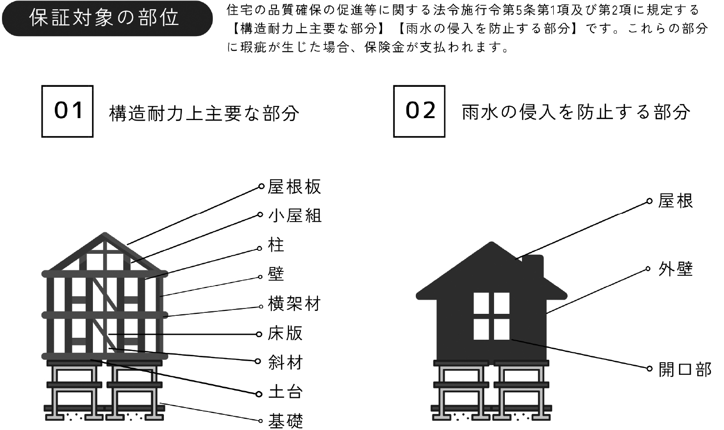 具体的には、「建物を支える骨組み(構造耐力上主要な部分)」と、「雨漏りを防ぐ部分(雨水の浸入を防止する部分)」が対象です。 もしもこれらの箇所に瑕疵(欠陥)が見つかった場合、補修費用が保険でカバーされます。不具合の際はスタッフが迅速に駆けつけ対応いたしますので、どうぞご安心ください。