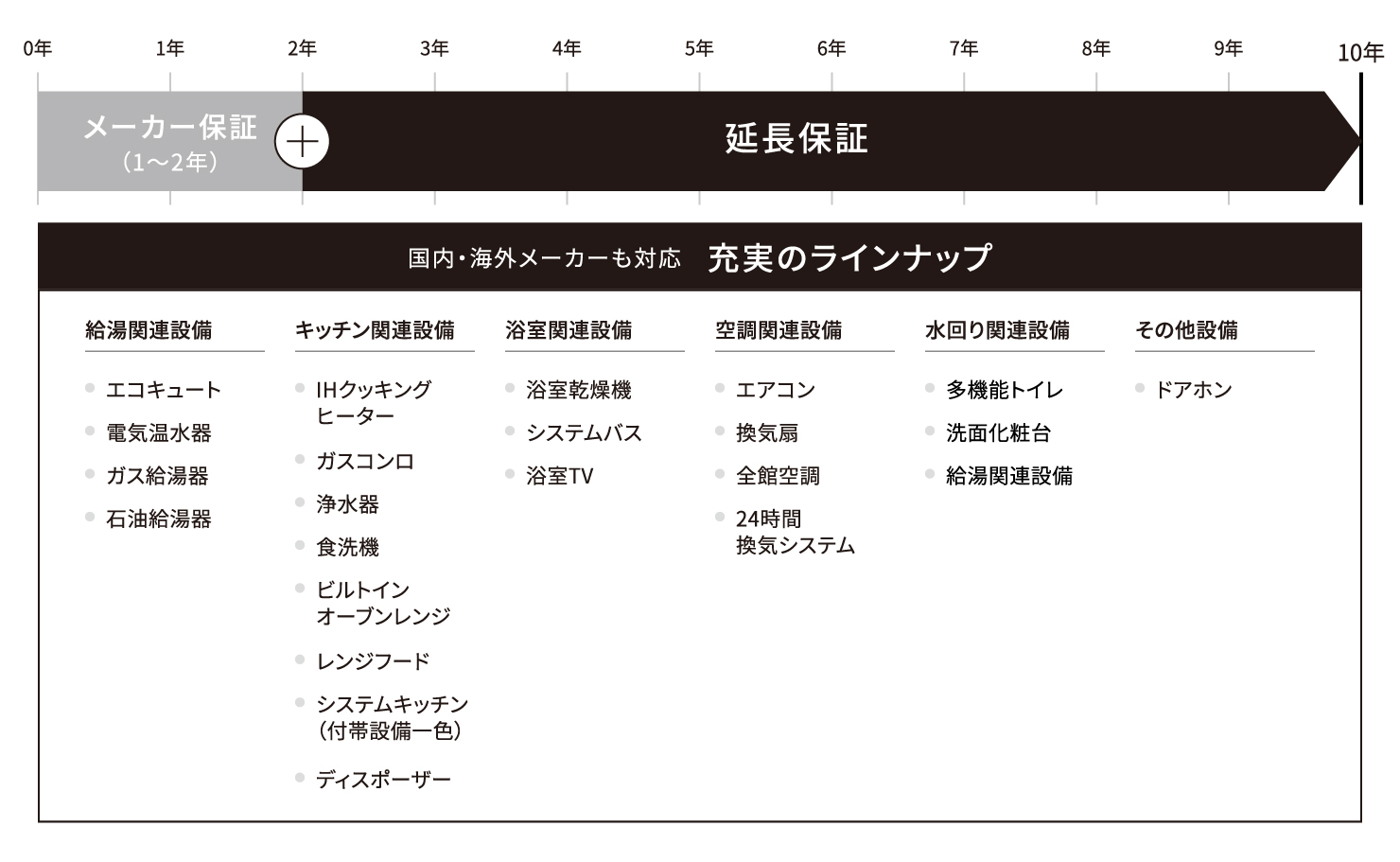 給湯器、キッチン、バスルーム、空調など、暮らしに関わる主要な設備が対象です。 国内メーカーはもちろん、海外メーカーの設備にも対応しているため、こだわりの機器を選んでも安心が続きます。