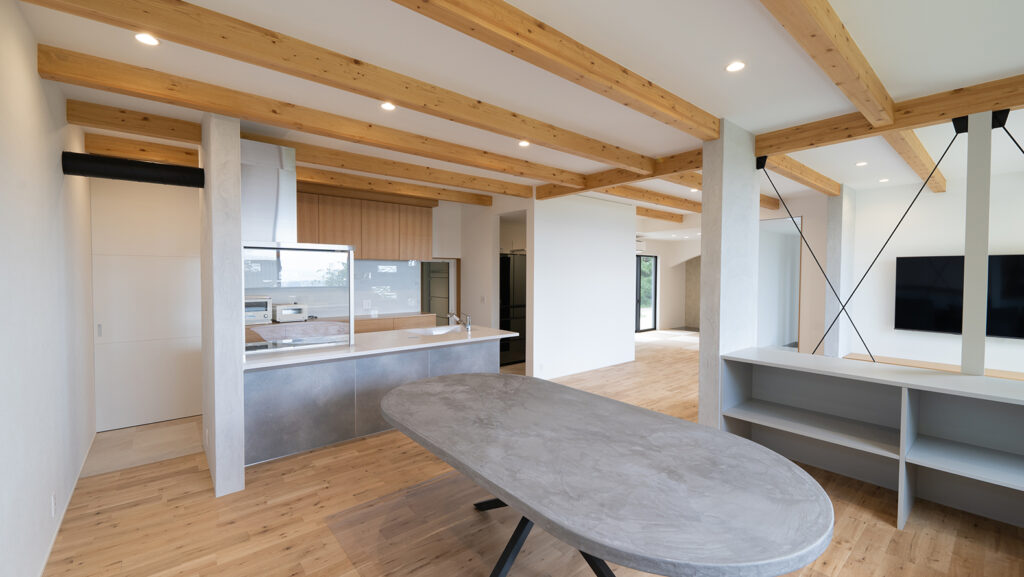 ポイントは、カウンターとリビングの仕切りに使われた筋交い(建物の強度を高める構造部分)。通常は壁で隠している部分ですが、あえて骨組みを見せるデザインにすることで、空間につながりを演出しました。
