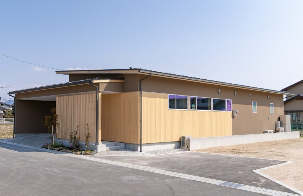 ナチュラルカラーの明るい木目デザインが大山の風景に溶け込む…