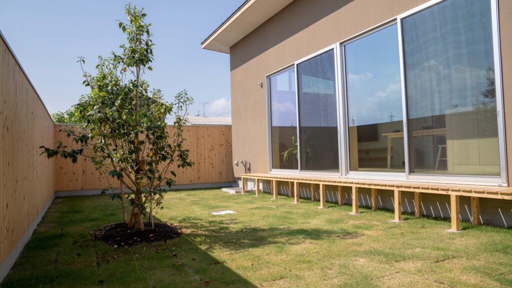 「コートハウス」のような木塀で囲ったプライベート感のある芝生で、ペットとの憩いの時間を過ごせます。