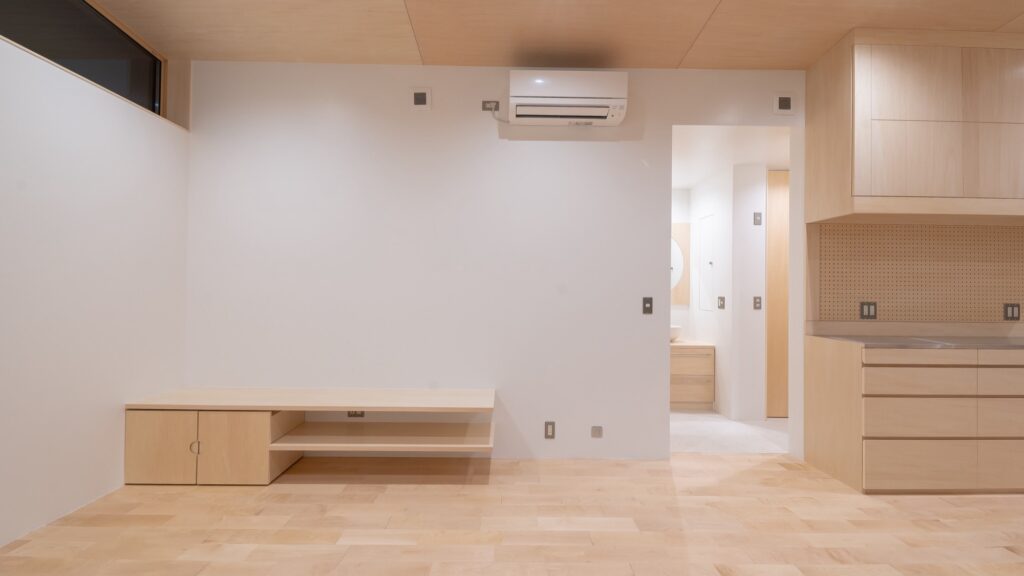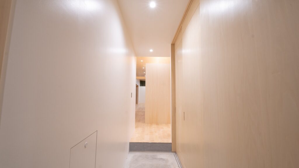 玄関から向かって右側は、キッチンと子ども部屋につながる家族用動線です。キッチンとリビング台は、自社で製作した造作家具。全体的に、ナチュラルな明るいカラーの木目で統一した、飽きのこないデザインを意識しています。