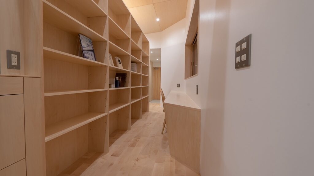 左側は、窓から大山が見える来客用のルートで、大容量の「造作の本棚」が並んでいます。