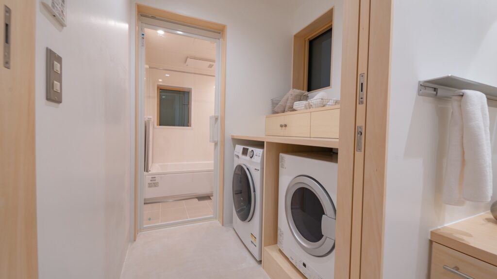 キッチンの後ろには洗面脱衣室と浴室があり、キッチンを中心にぐるりと回遊できるので、家事や生活動作が楽になります!