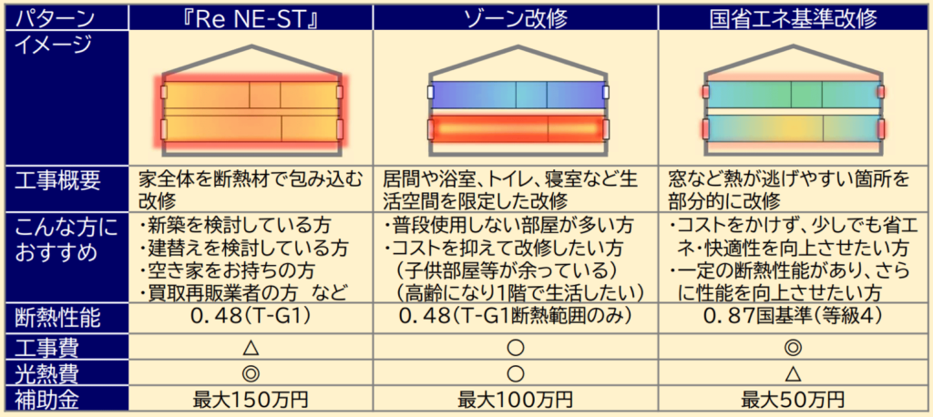 この制度では、「NE-ST」のT-G1(UA値0.48以下)相当や、国の省エネ基準(UA値0.87以下)を満たす断熱リフォームを行うことで、県から改修費用の助成が受けられます。